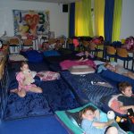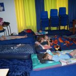 Na het eten begon het avondspel: vossenjacht in de heemtuin. We hadden ons bijna allemaal verkleed. Eerst ging de ene groep zoeken en de andere groep had zich verstopt. Daarna draaiden we de rollen om. Toen we terugkwamen had de leiding nog een avondactiviteit bedacht, maar er werd spontaan gevraagd of de pyjama’s aan mochten!!!! Nadat we nog wat gegeten en gedronken hadden, werden de tanden gepoetst en ging iedereen in zijn meegebrachte bedje liggen. Er werd nog een film gekeken en om 22.30 uur gingen we slapen. De volgende ochtend gezellig met zijn allen aan het ontbijt, daarna snel alles opgeruimd (de koster was er ook al vroeg) en toen als afsluiting met zijn allen naar de kerkdienst.