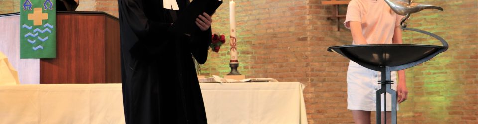 afscheid van kinderen van kindernevendienst en officieel welkom heten in de kerk (overstap) bij het doopvont